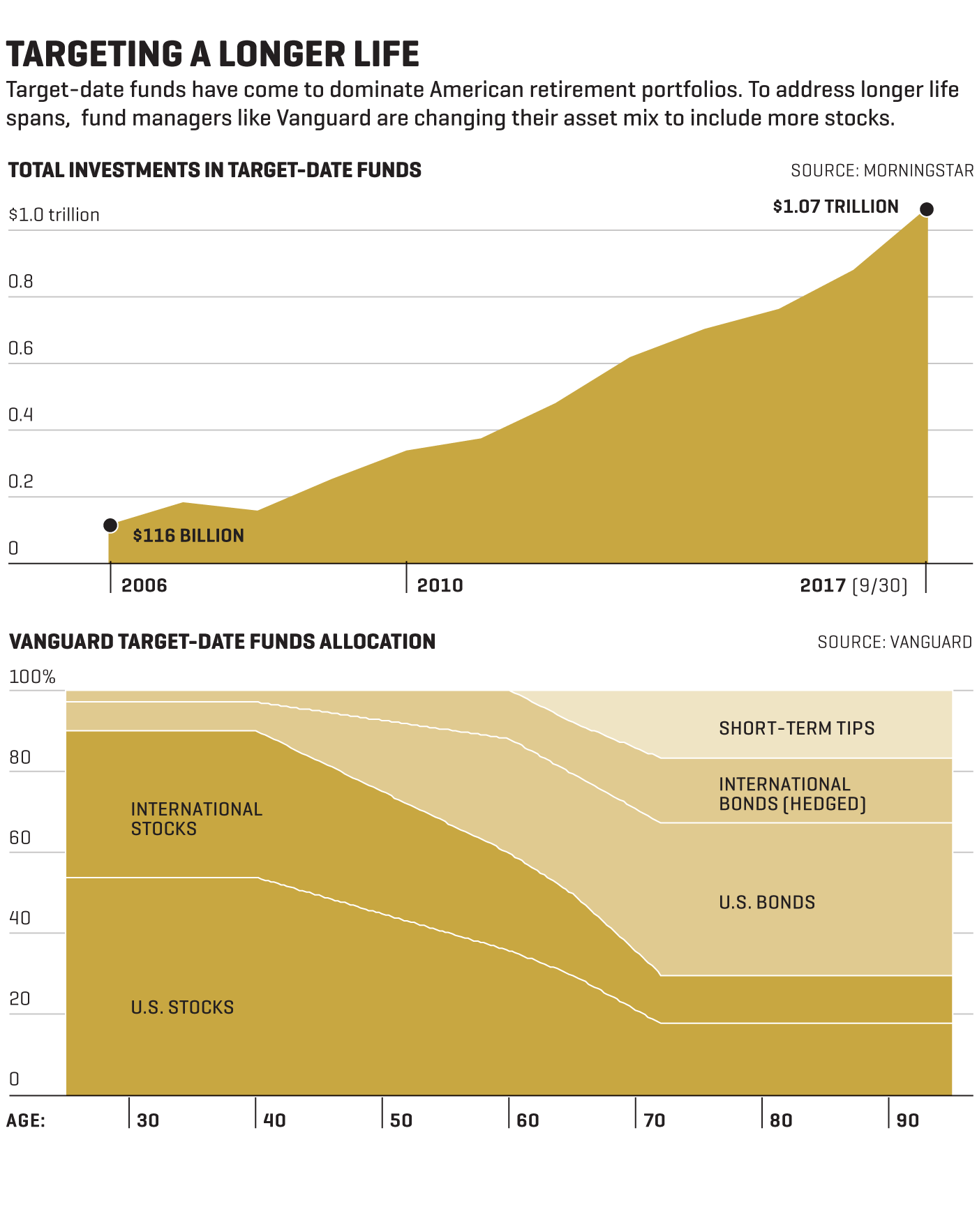 In response, financial services companies are building longevity risk more intrinsically into their products. To witness how longevity is changing the business, just look at target-date mutual funds (TDFs). The one-stop shopping cart of retirement vehicles, they are designed to put you on a comfortable “glide path” toward retirement—owning more equities when you are young, more fixed income and cash when you are older—while keeping investors from having to make potentially wealth-destroying decisions about timing the market. (The “target date” roughly corresponds to the year the hypothetical investor reaches retirement age.) At a time when many mutual funds in general have fallen out of fashion, TDFs have gobbled up the investing world, having amassed $1.07 trillion in assets at the end of October, according to research shop Morningstar, up from $116 billion at the end of 2006.