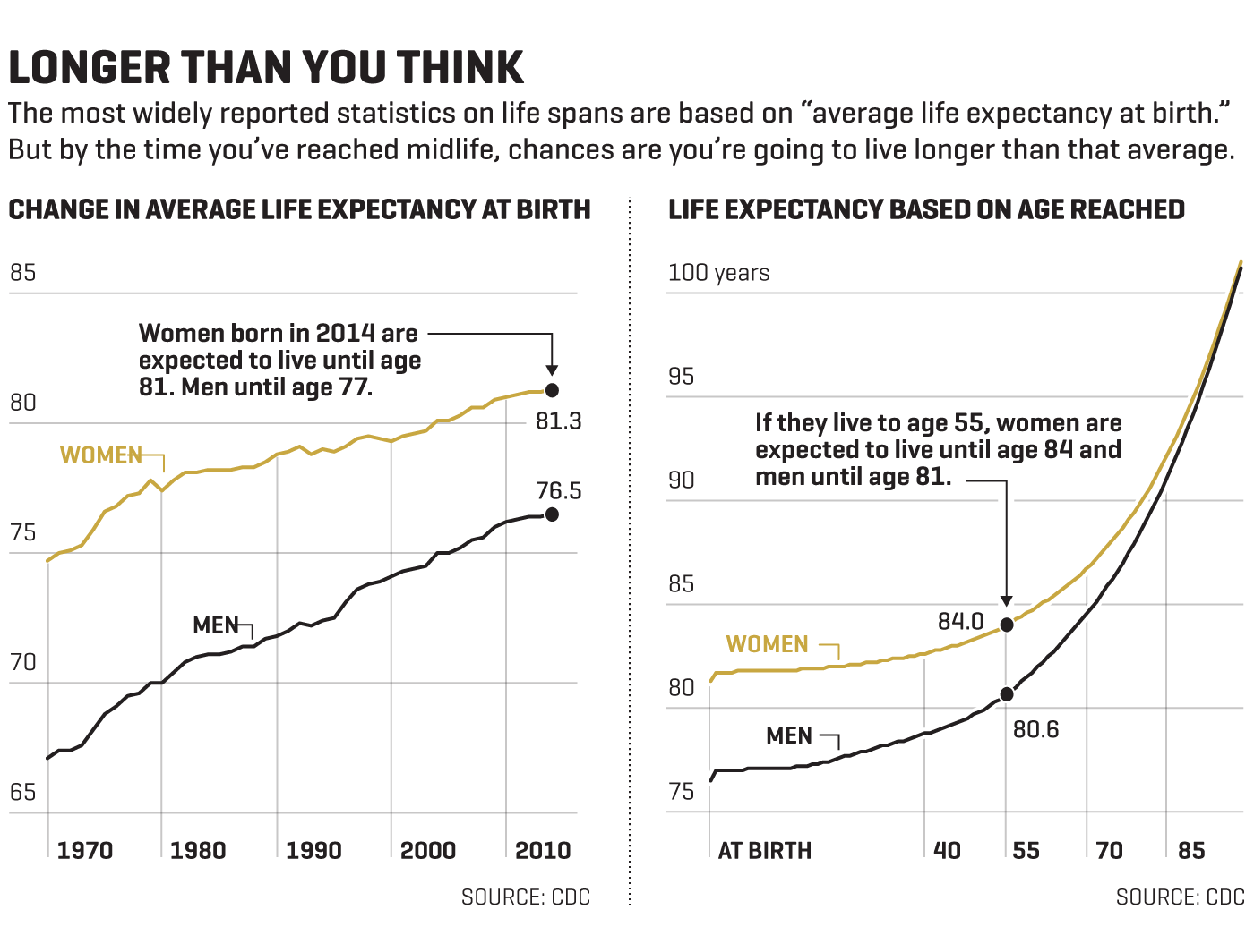 Part of the problem stems from a misunderstanding of statistics. Stats from the Centers for Disease Control and Prevention say that American men born today can expect to live 76.5 years, on average, and American women 81.3. But those numbers reflect life expectancy at birth and are dragged lower by people who die young.