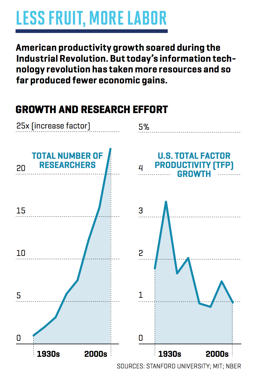 So given all that, it would seem absurd to suggest that innovation is somehow less potent than it once was—that, somehow, all those new ideas we’re generating are offering less bang for the buck. But that is precisely what one group of economists have concluded. And it’s worth assessing their argument for a number of reasons, because it has enormous implications for businesses, investors, and society as a whole.