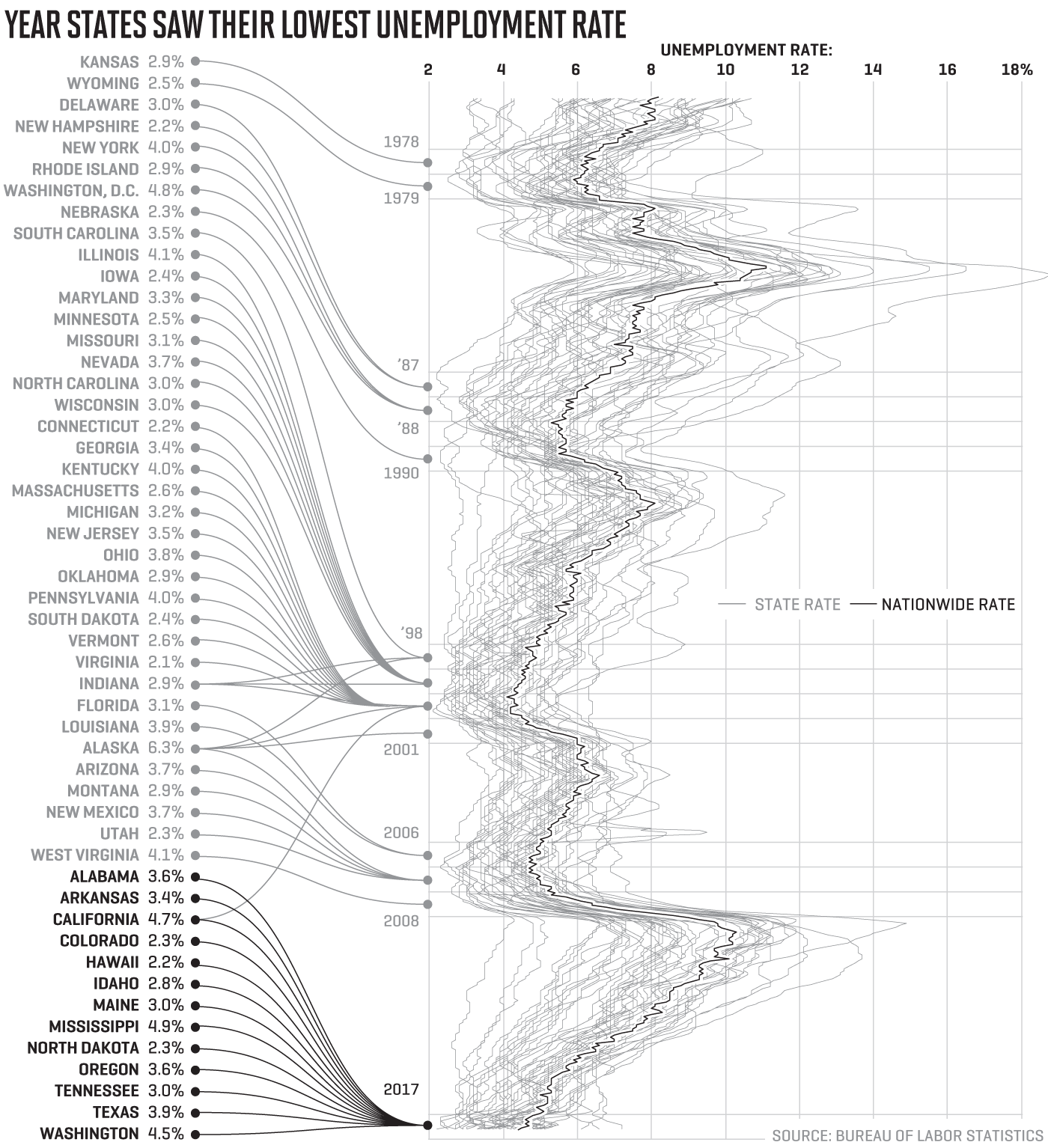 The job market can’t get much tighter. In October the U.S. unemployment rate dropped to 4.1%—the lowest level since December 2000, when it hit 3.9%. October also marked a record-setting 85th straight month of job gains, dating back to 2010. That job creation is reaching into virtually every corner of the country. This year a remarkable 12 states have recorded their lowest unemployment rates since the Bureau of Labor Statistics began tracking state figures in 1976, and California matched its previous low. (One outlier is Alaska, with the nation’s highest rate at 7.2%.) The big question: When will wages, up a weak 2.4% annually in October, finally begin to reflect the strong demand for labor?