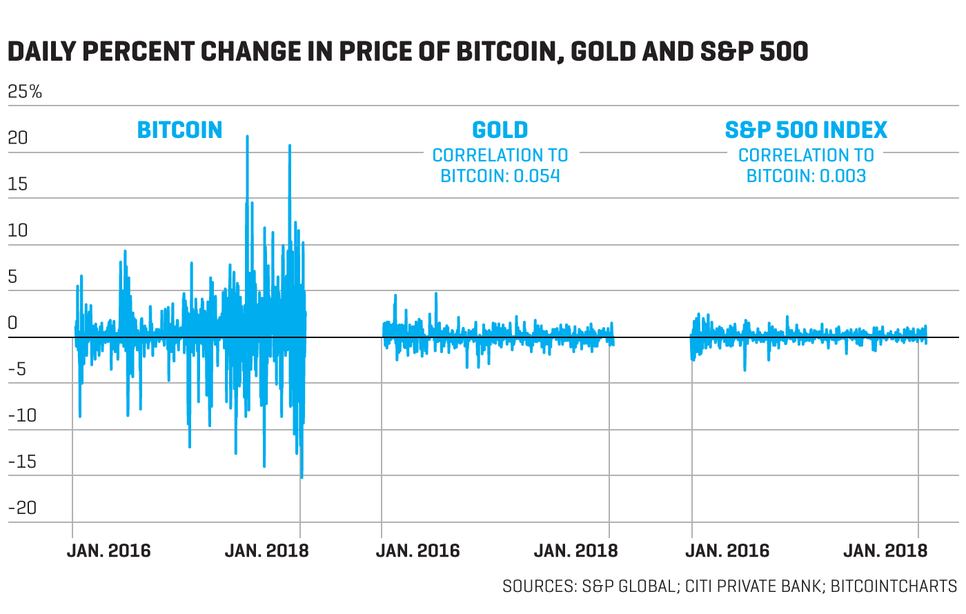 Bitcoin, on the other hand, not only is far more volatile than both stocks and gold (as illustrated in the chart above), but trades unpredictably, even maniacally, without any relationship to other assets or even gold itself. In its analysis, Citi Private Bank found that Bitcoin’s correlation to the S&P 500 was virtually zero, while its correlation with gold was .054, meaning gold and Bitcoin only trade in sync about 5% of the time—a relationship so negligible as to be insignificant.
