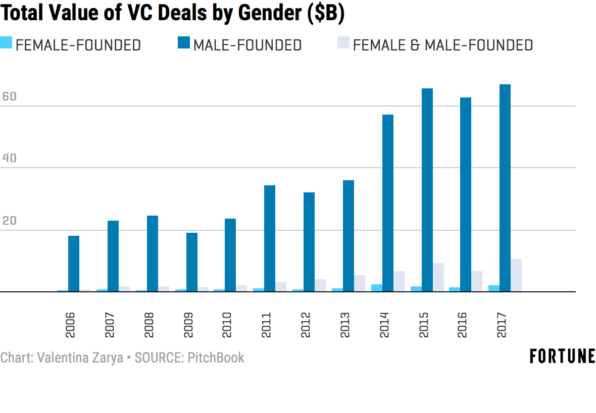 But while the #MeToo movement may be altering some aspects of the VC landscape, it hasn’t yet translated into many more dollars for female founders. All-women teams received just $1.9 billion of the $85 billion total invested by venture capitalists last year, according to data on the from M&A, private equity, and VC database PitchBook. That’s equal to about 2.2% of 2017’s total pot. Meanwhile, all-male teams received about $66.9 billion—roughly 79%. (Of the remaining 19%, 12% of funds were raised by mixed-gender teams, while 7% was raised by teams whose gender makeup PitchBook was unable to confirm.)