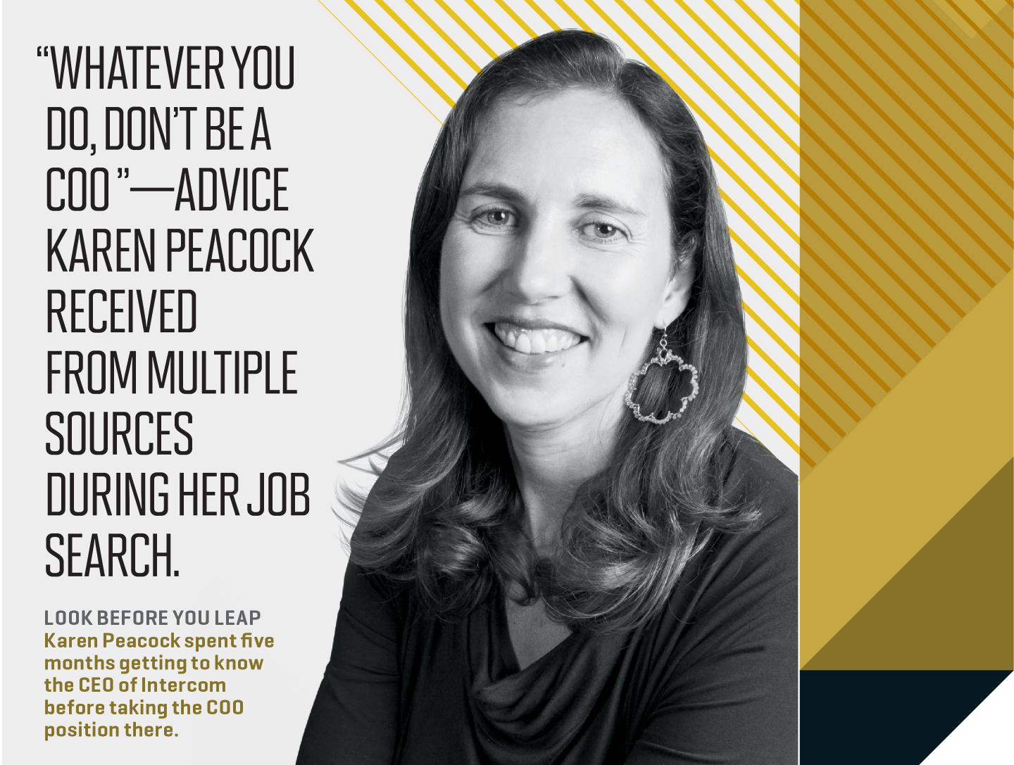 Karen Peacock had some of these concerns in mind when she left Intuit to seek a more entrepreneurial role. As a senior vice president, she had responsibility for Intuit’s 500-person, $2.5 billion small-business unit, including its QuickBooks brand. As she started the job hunt, several of the advisers she consulted gave her the same advice: “Whatever you do, don’t become a COO.” Those advisers thought Peacock was ready for a CEO role—and indeed, she says she was offered several such positions. But she also considered COO opportunities, and as she did so, she studied the reasons the role can be problematic. She found that the COO-CEO partnership tended to work better when it was based on shared values, where the two have different skill sets and the CEO is willing to “divide and conquer,” and where there are clear expectations on how to handle disagreements. Before deciding to join Intercom, a customer messaging platform, as COO, Peacock spent five months getting to know the cofounder and CEO, Eoghan McCabe.
