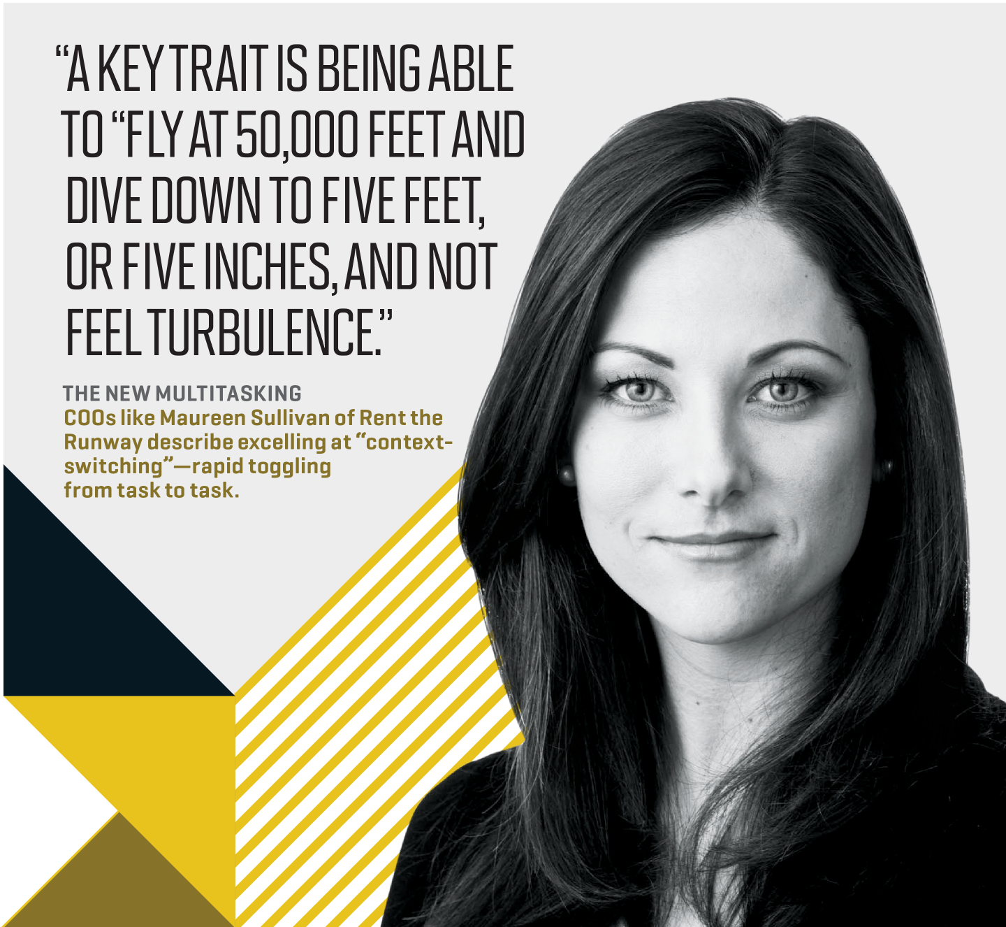 So what are these second-to-none COOs like? They tend to be focused, efficient, and quick learners. They are experts at multitasking—and even more so at its second cousin, “context-switching,” which is essentially single-tasking but switching from task to task a lot. (“I can context-switch like no one you’ve ever seen,” says Johnson of Stripe.) Maureen Sullivan, COO of fashion-rental startup Rent the Runway, says a key trait is the ability to “fly at 50,000 feet and dive down to five feet or five inches and not feel turbulence.”