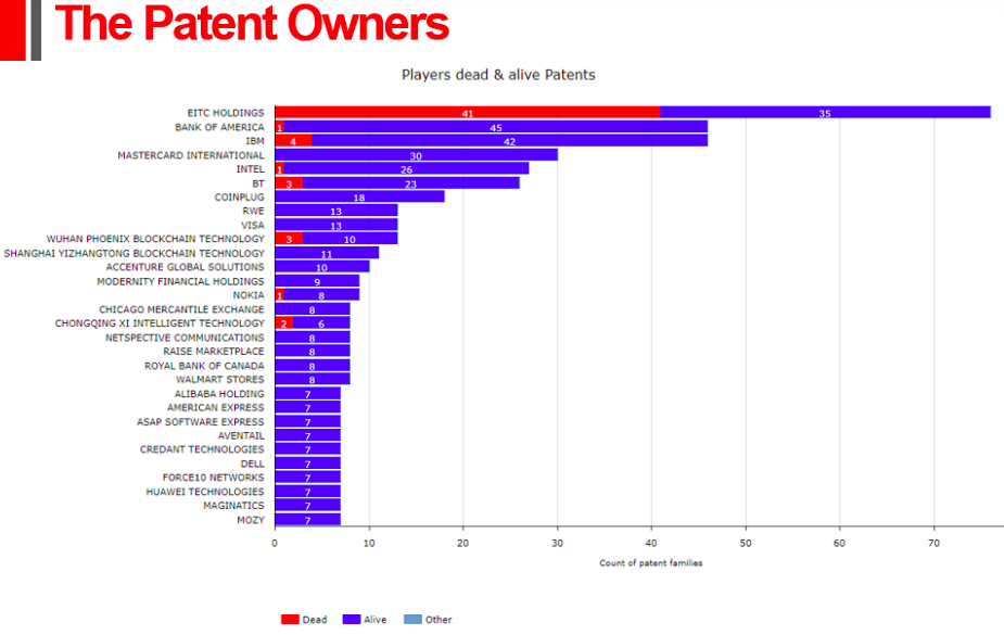 His findings also show financial firms are among the top blockchain patent owners, but that tech companies and Wal-Mart also have a big presence. Here’s a list (the number of current patents a company holds is shown in blue):