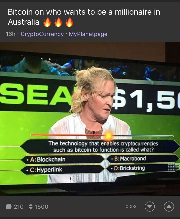 Who Wants To Be A Brickstringaire? On the Australian version of the gameshow Who Wants To Be A Millionaire?, the question writers tried to mislead a contestant with a false alternative to the technology underlying cryptocurrencies: (D) Brickstring. Damon Beres, a tech editor at Medium, tweeted out the below screenshot saying, "This is too much."
