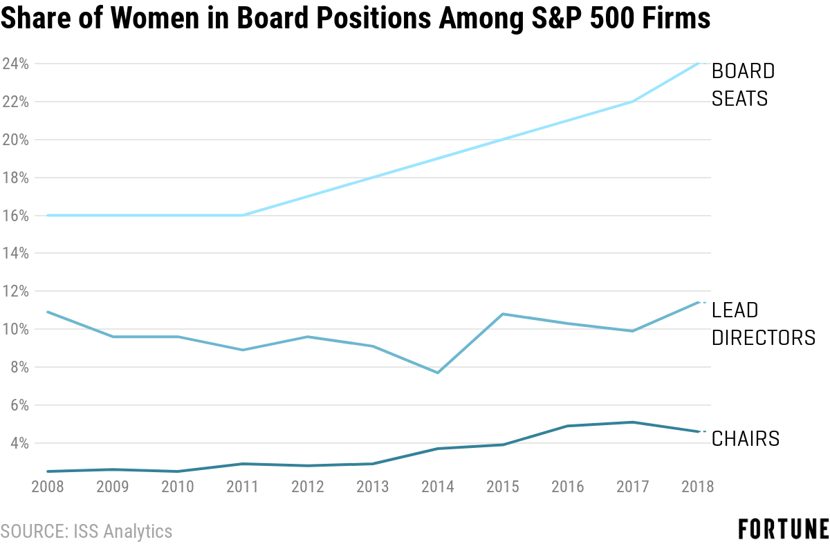 Much has rightfully been made about the lack of women on corporate boards. That figure has inched up from 16% in 2008 to 24% this year to date among S&P 500 firms, according to ISS Analytics, the data intelligence arm of Institutional Shareholder Services. Despite that uptick, the share of women who’ve ascended to board leadership positions has barely budged. Women made up 10.9% of lead directors in the S&P 500 in 2008 and 11.4% in 2018. They were 2.5.% of chairs in 2008; they’re 4.6% now.