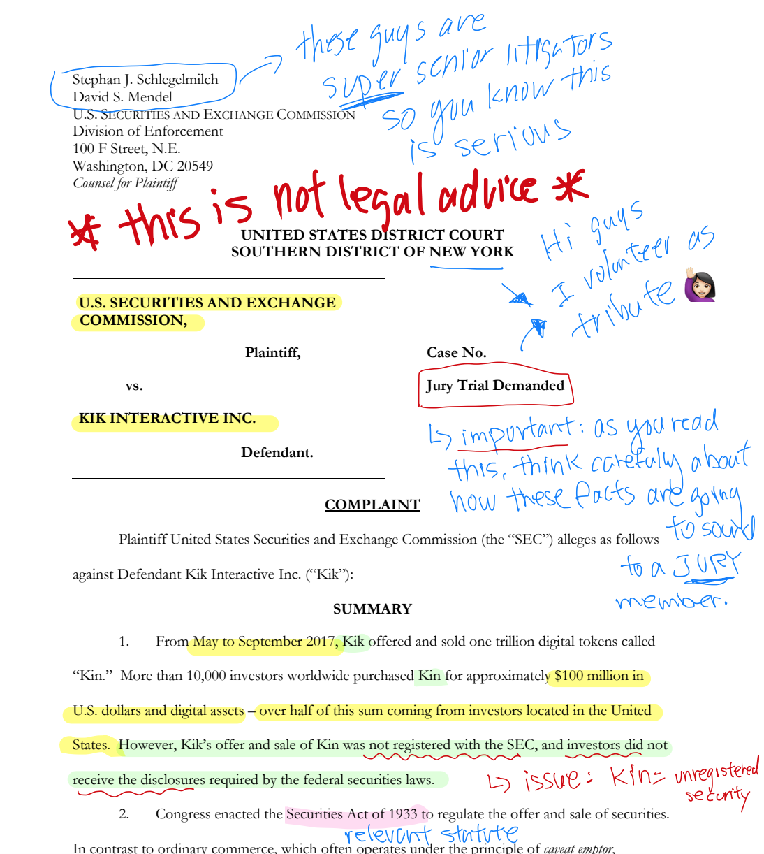 This is not legal advice. Even if you've already read the SEC's complaint against Kik, as well as the many think pieces analyzing the situation (including several published by Fortune), it's still worth taking a look at Katherine Wu's colorful "annotated guide" to the 49-page document. Wu, who formerly oversaw business development for crypto research firm Messari, has highlighted and marked up the SEC document with a rainbow of colors and emojis, and served up insights such as, "Breaking news: Tokens are not the way to monetize a previously shitty business model."