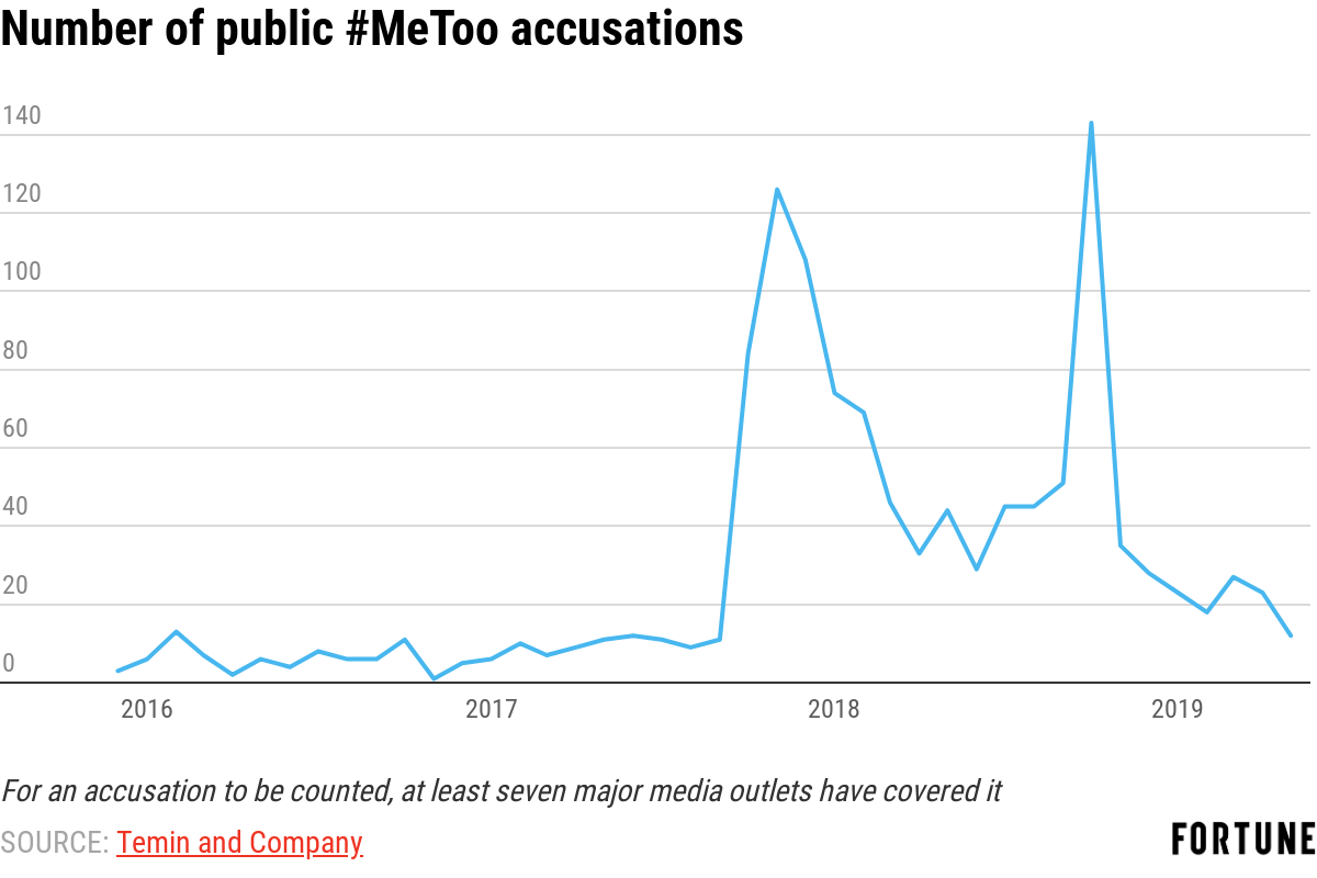 •#MeToo malaise? Have we reached the point of #MeToo malaise? New data from crisis consulting firm Temin and Company finds that last month saw 12 high-profile allegations. That’s the lowest monthly total since claims against movie mogul Harvey Weinstein ignited the #MeToo movement in the fall of 2017 and a dramatic drop from a peak of 143 last October.