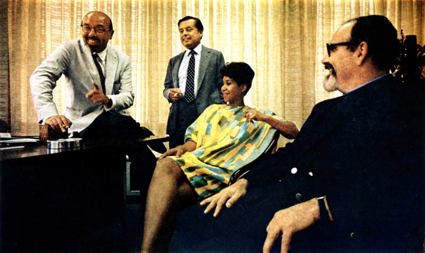 The three men who run Atlantic Recording Corp.—Motown’s most astute competitor—have proved that being born in a Negro slum is not the only way for independents to succeed in the rhythm-and-blues business. Ahmet Ertegun (left), forty-four, president, his brother Nesuhi (standing), forty-nine, a vice president, and Jerry Wexler (seated right), fifty, another vice president, regularly turn out pop-music hits with such artists as Aretha Franklin, a brilliant young blues singer, seen above with the three men. (This year Atlantic has sold more than one million copies of two different Aretha Franklin records.)