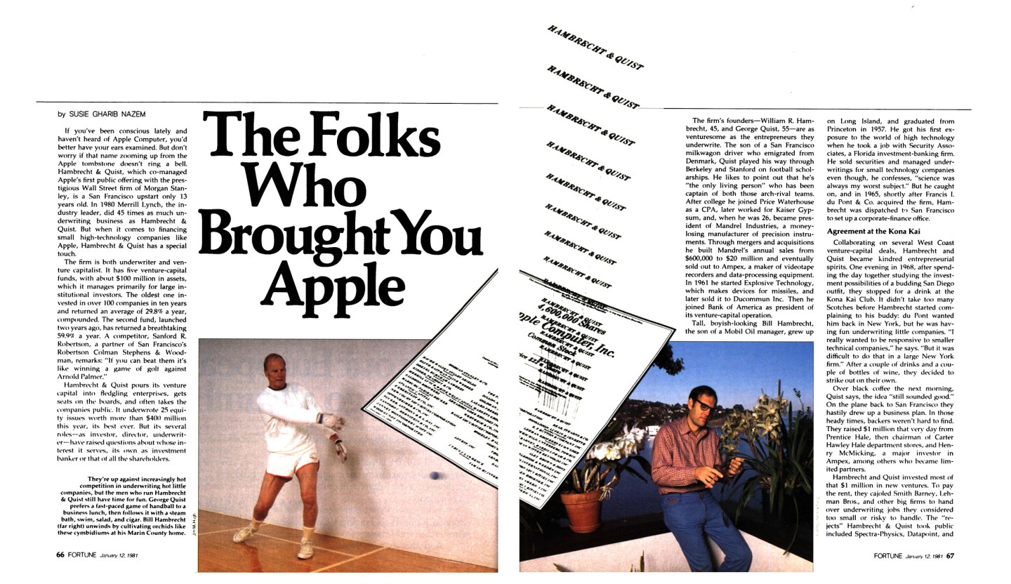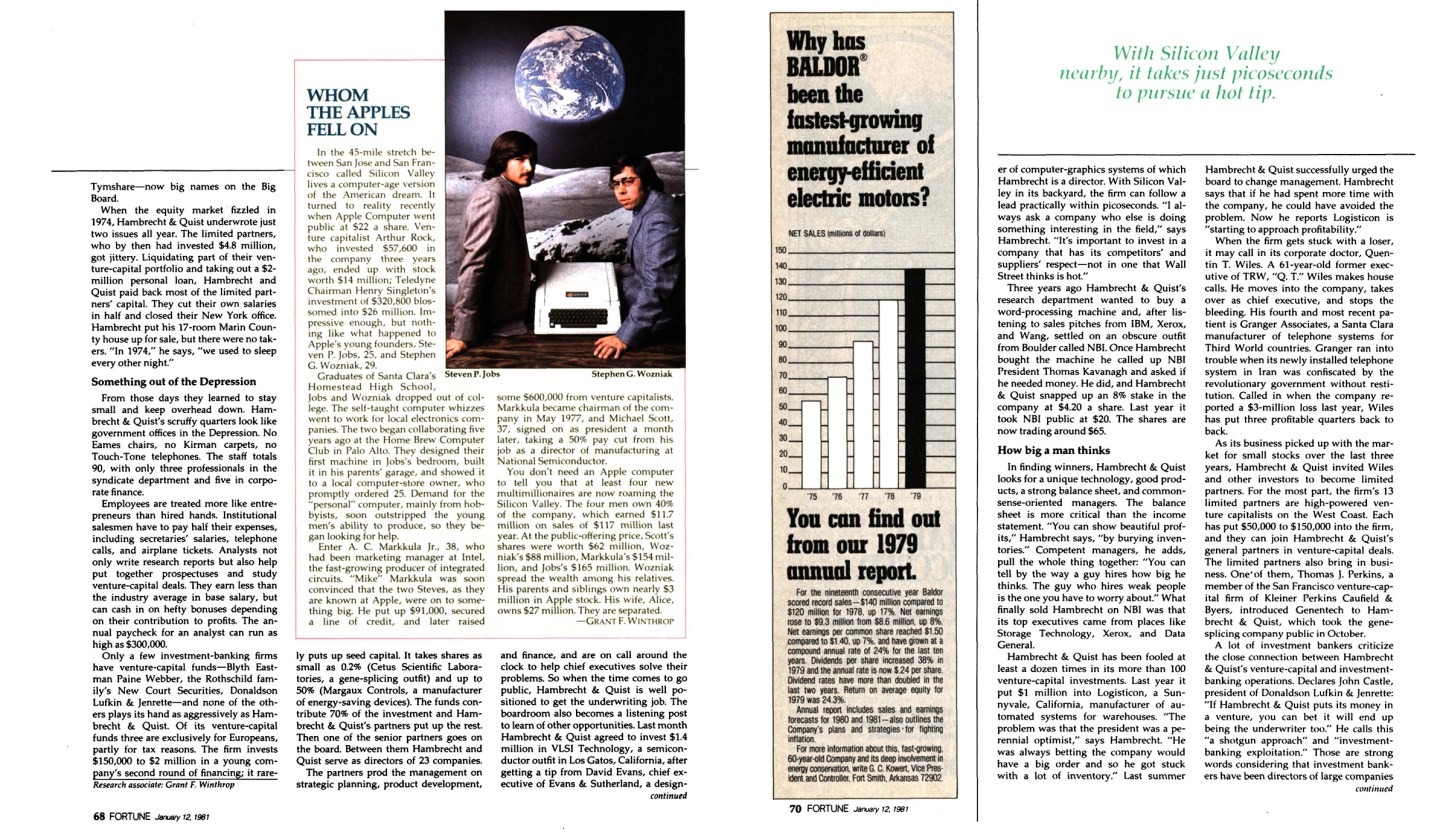 Hambrecht and Quist invested most of that $1 million in new ventures. To pay the rent, they cajoled Smith Barney, Lehman Bros., and other big firms to hand over underwriting jobs they considered too small or risky to handle. The “rejects” Hambrecht & Quist took public included Spectra-Physics, Datapoint, and Tymshare—now big names on the Big Board.