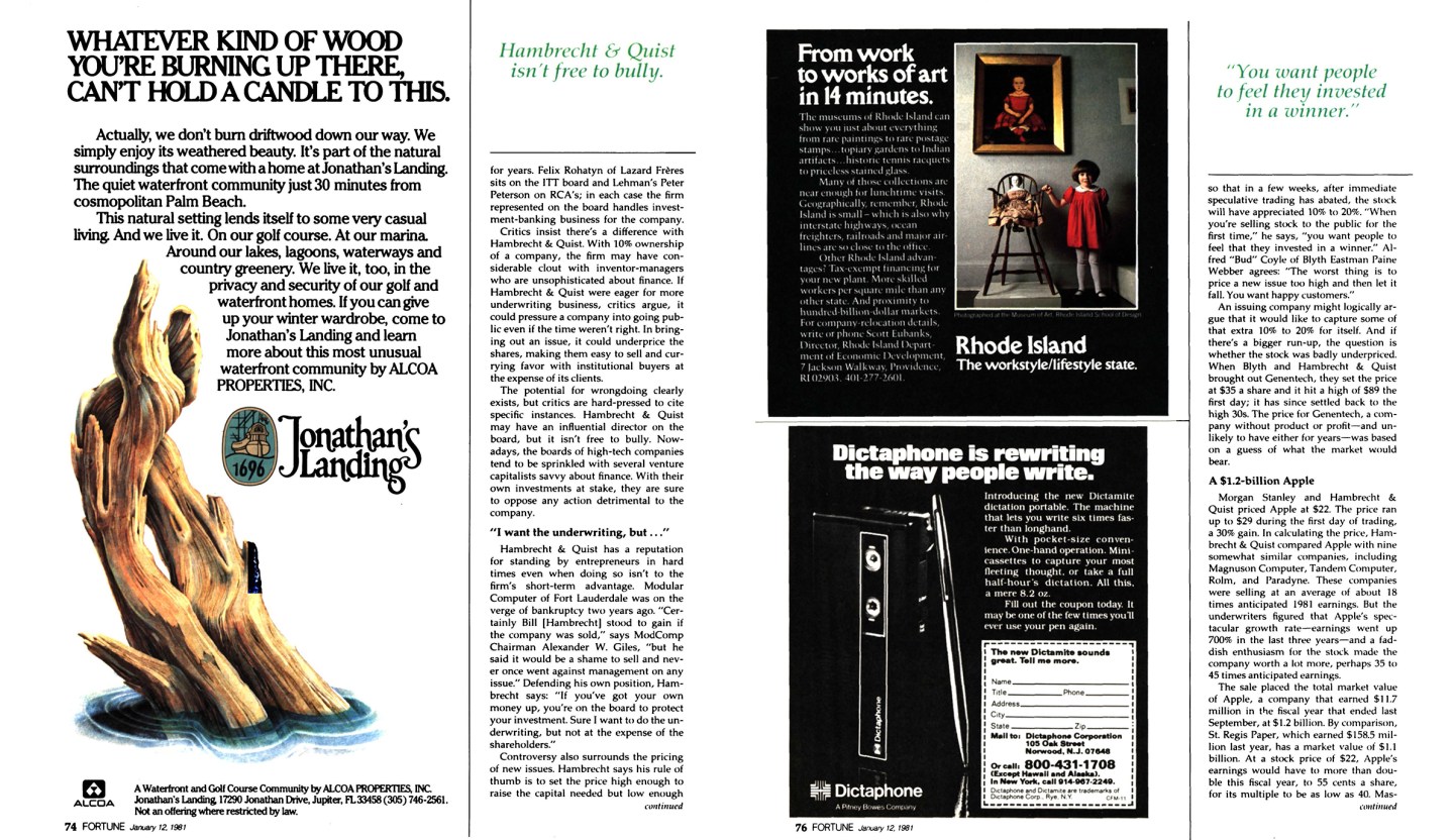 Morgan Stanley and Hambrecht & Quist priced Apple at $22. The price ran up to $29 during the first day of trading, a 30% gain. In calculating the price, Hambrecht & Quist compared Apple with nine somewhat similar companies, including Magnuson Computer, Tandem Computer, Rolm, and Paradyne. These companies were selling at an average of about 18 times anticipated 1981 earnings. But the underwriters figured that Apple’s spectacular growth rate—earnings went up 700% in the last three years—and a faddish enthusiasm for the stock made the company worth a lot more, perhaps 35 to 45 times anticipated earnings.
