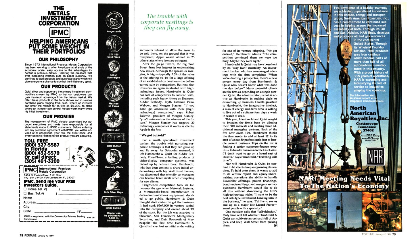 Three years ago Hambrecht & Quist’s research department wanted to buy a word-processing machine and, after listening to sales pitches from IBM, Xerox, and Wang, settled on an obscure outfit from Boulder called NBI. Once Hambrecht bought the machine he called up NBI President Thomas Kavanagh and asked if he needed money. He did, and Hambrecht & Quist snapped up an 8% stake in the company at $4.20 a share. Last year it took NBI public at $20. The shares are now trading around $65.