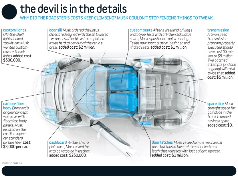 And rather than use the fiberglass body panels from the Elise that Eberhard had suggested, Musk insisted on carbon fiber, a lighter, stronger, and “cooler” material, in his opinion. He then went on to redesign the headlights and the door latches. After riding for a weekend in an early Roadster model and taking a beating in the standard Lotus seats, he insisted that custom seats be developed. Every change meant additional cost and time (for more, see “The Devil Is in the Details”). “I always argued that we would sell exactly as many cars whether the door latches were push-button or electronic, whether the body panels were carbon fiber or fiberglass,” Eberhard says. “All the nicer, cooler, faster stuff increased risk.”