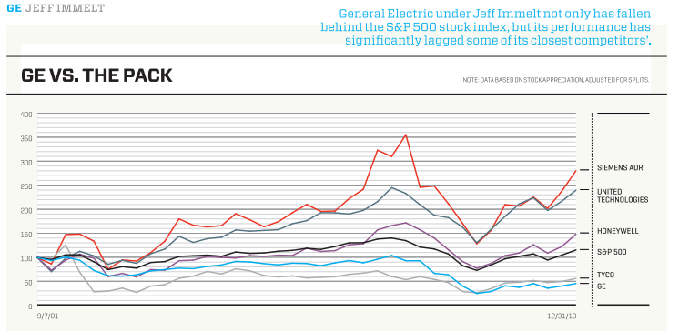 You could even argue that the stock’s miserable run under Immelt isn’t nearly as bad as it looks because the price was irrationally high when he got the job. At $40, it was still coming down off its bubble market peak of $60. Number crunching by the EVA Dimensions consulting firm shows that the $40 price meant that investors were expecting GE’s economic profit (earnings after a capital charge) to increase by some $3 billion a year for 10 years and then hold at that level; the company’s economic profit would now be about $40 billion a year and expected to stay there forever. Such an expectation was nuts. The highest economic profit ever achieved (excluding super-major oil companies, whose numbers were briefly skewed by oil price spikes) was Microsoft’s (MSFT) $15 billion in 2007. At GE last year the figure was $3.9 billion. If the stock had been priced more sanely — $20 would have been realistic, even without knowing that 9/11, a financial crisis, and a recession lay in the future — and one then considers the dividends GE has paid to investors, Immelt’s performance vs. the market looks respectable.