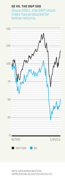 Plenty have called for his head. A “disaster” is the description used by MarketWatch columnist Brett Arends, Seeking Alpha columnist Steven Towns, and many stock market bloggers. But no major shareholder has attacked Immelt publicly. No proxy advisory firm has told clients to vote against him as a director. The board is officially mum, but people close to the directors say he still has their confidence. Director A.G. Lafley, Procter & Gamble’s (PG) former CEO, is showing his support in the sincerest way: SEC filings show that in January he bought 25,000 shares of GE. Still, Immelt’s record isn’t one that anybody, not even this board, would want. When he got the job on Sept. 7, 2001, GE stock was $40 a share. Almost 10 years later, it’s around $20. The company’s credit rating was AAA, the best, awarded to only a handful of enterprises; no more. It was the most valuable company on earth, commanding the highest market capitalization. Today it’s about No. 8 (its rank varies day by day), just behind Royal Dutch Shell.