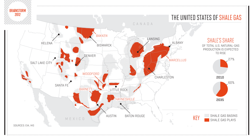 Over the past several years fracking has unlocked a vast new source of energy supply in the U.S. Advanced forms of the process that Tillerson used in the 1970s, combined with innovative methods of drilling, have enabled energy companies to extract huge quantities of natural gas and oil trapped in shale rock — assets that were previously thought to be either impossible or uneconomic to produce. Production from large shale deposits, or “plays,” such as the Barnett in Texas, the Haynesville in East Texas and Louisiana, and the vast Marcellus in the Northeast, has surged.