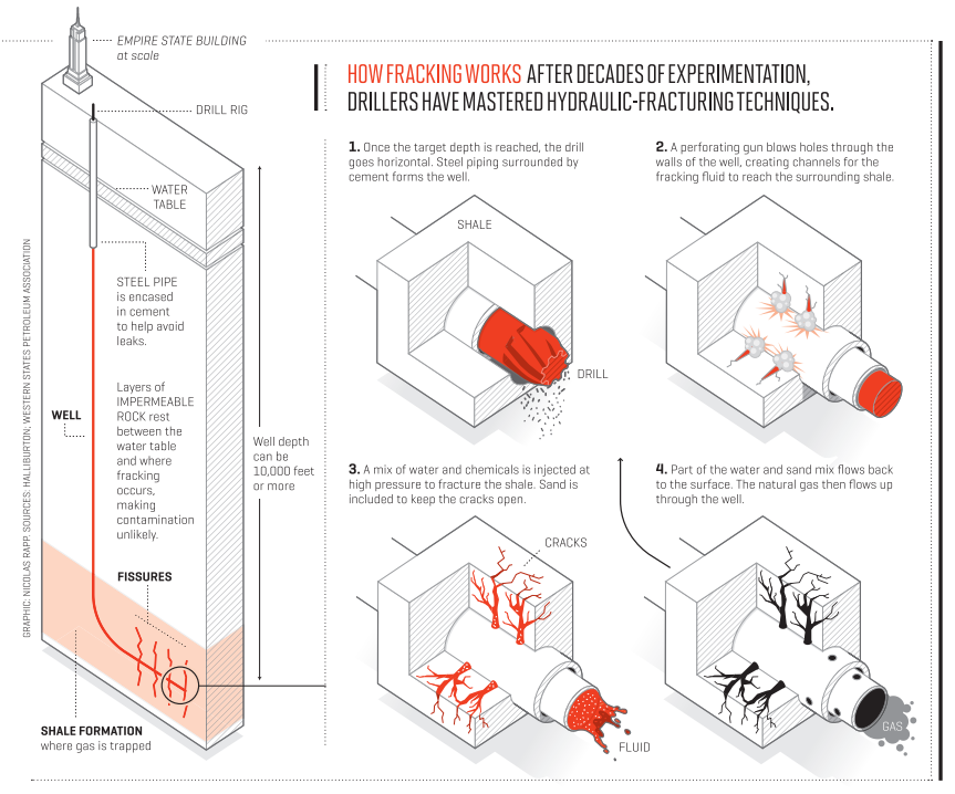 After the drill enters the Woodford, the crew at the Gayle site will slowly turn it sideways and then drill horizontally for another 5,000 feet through the shale. That makes it possible to hydraulically fracture a large section of rock from a single well. (See “How Fracking Works” graphic to the right.) It’s the combination of horizontal drilling with fracking that has enabled the massive growth of shale gas production.