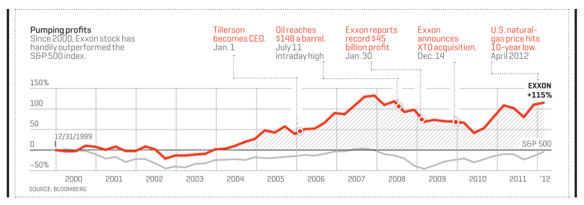 In buying XTO, the 60-year-old Tillerson has further reshaped the company. In 2011, Exxon reported sales of $486 billion — a gargantuan number that could vault it past Wal-Mart (WMT) to recapture the No. 1 position in this year’s Fortune 500. The $41 billion in profit it earned was the second-largest total in corporate history, behind only the $45 billion record that Exxon set in 2008. Those astronomical earnings have been driven by persistently high oil prices. But today Exxon, the prototypical oil giant, gets about 50% of its production from, and has 50% of its reserves in, natural gas. The company’s stock has risen 77% since Tillerson became CEO at the beginning of 2006, compared with 29% for the S&P 500 index (SPX). To deliver the future returns that its shareholders expect, Exxon needs the XTO purchase — which so far hasn’t lived up to its promise because of falling natural-gas prices — to pay off bigtime. Tillerson has good reason to believe it will.