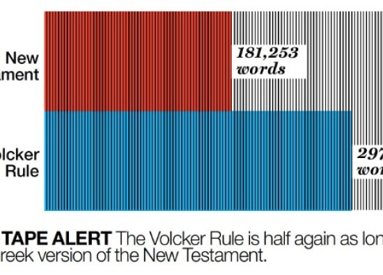 The rule has 71 pages, which is a lot of words to transform former Fed chairman Paul Volcker’s simple-sounding proposal into law. His idea, as you probably know, was to ban big financial institutions from putting taxpayers at risk by using federally insured deposits for securities speculation. But the rule itself is only the start of the complexity. It comes with an 892-page explanation. Combine the two parts and you have an opus half again as long as the New Testament, and one that to regular people might as well be written in the original Greek.