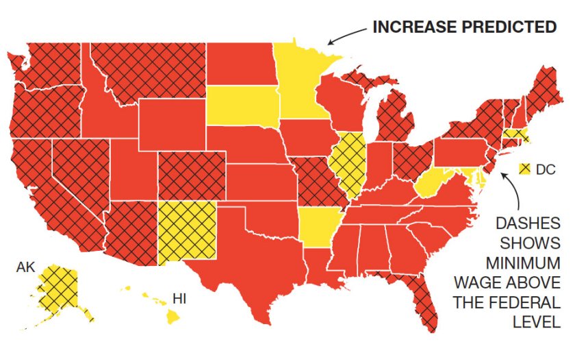Two decades after the Living Wage movement began in Baltimore (when local homeless shelters began filling with residents who had full-time jobs), popular support for a hefty increase in the minimum wage resurges. States are already taking action (see upcoming map). Odds that the federal minimum wage is increased to $10.10/hour, from the current $7.25: 48%
