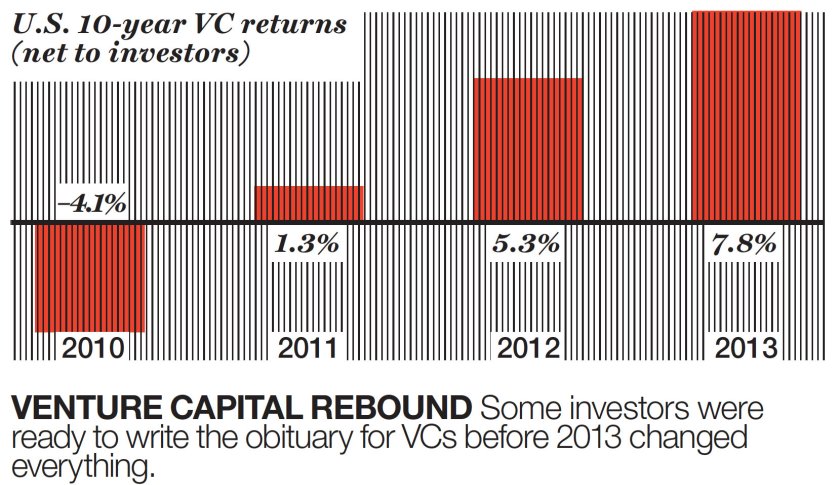 Here are two basic facts about business cycles: (1) They exist, and (2) people often dispute that, particularly in the midst of a prolonged top or bottom. So it has been for venture capital since the dotcom bubble burst more than a decade ago, with even industry insiders adopting defeatist language about their “broken model.” The worst came in 2010 when median 10-year performance turned negative and a slew of longtime institutional investors began to abandon all but a small handful of VC firms. If venture capital had always been a cottage industry, it had become that cottage’s supply closet.