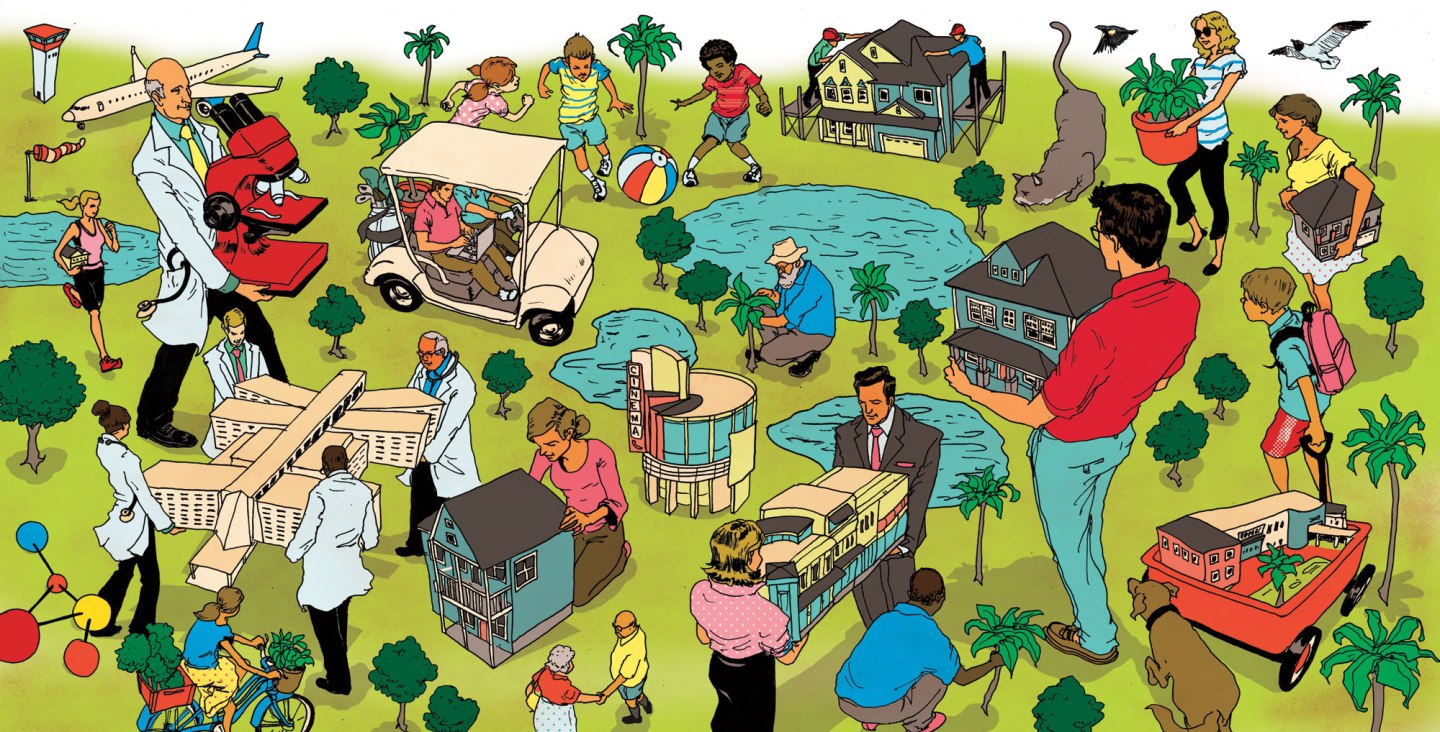Lewis thought about some biotech investments he held in San Diego, which he had made in part because of the research cluster that existed there and the talent it attracted. Why couldn’t the same be done in Florida? Bush visited Southern California and came back enthusiastic. The beginnings of a plan took shape: They would create a medical cluster, using Lewis’s land to build a residential community emphasizing health, education, and sustainability. Today such an idea seems trendy; a decade ago it was fresh thinking.