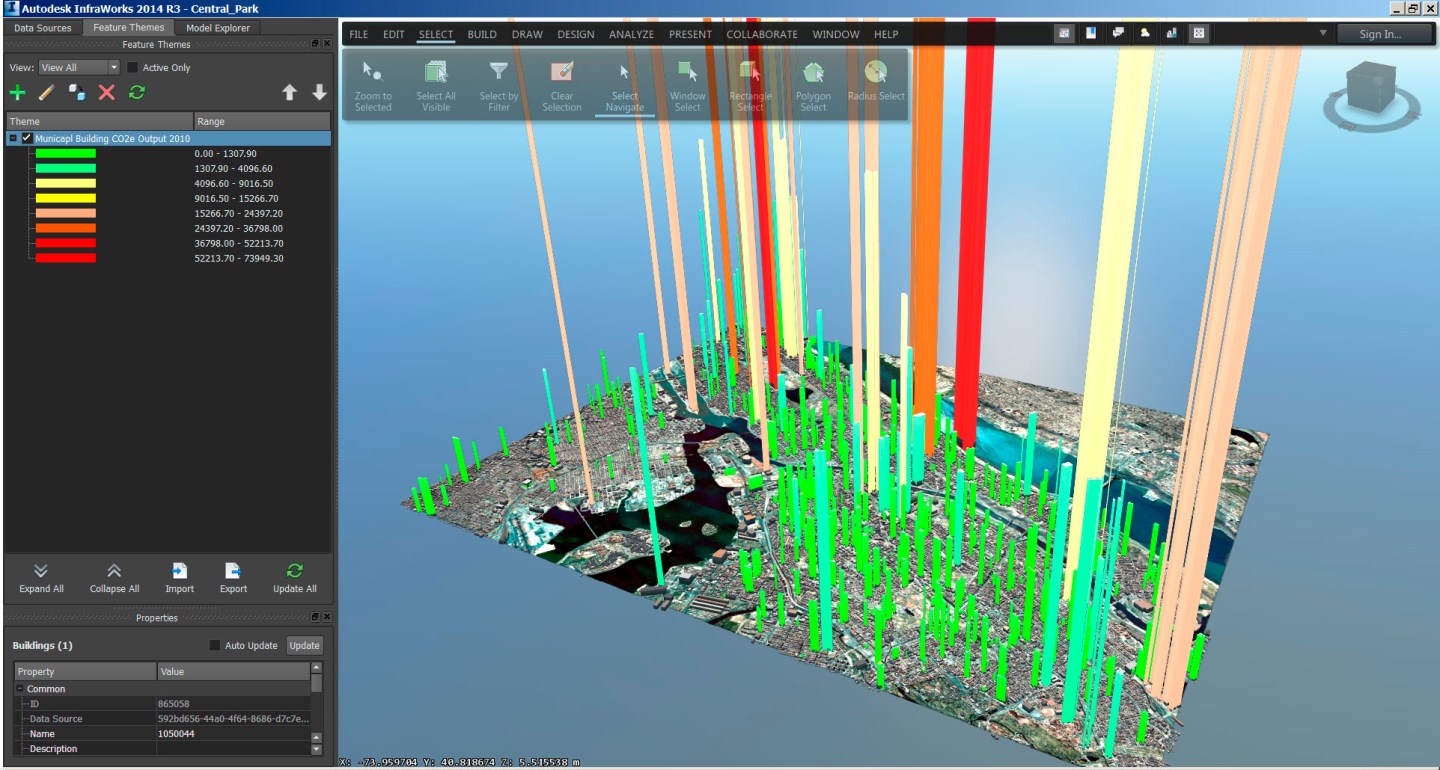 New York City can track and visualize their GHG emissions and energy and water consumption. This Autodesk InfraWorks 360 model shows how much greenhouse gas the city’s municipal building are emitting. Courtesy: Autodesk