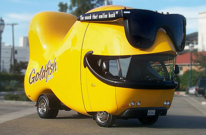 It's the snack that smiles back, but in gigantic, automobile form. What’s not to like about a large, happy goldfish cracker on wheels? That’s what one gets -- a grin -- when checking out the Pepperidge Farm Goldfish Mobile, a wonder concocted by Prototype Source, a maker of mobile marketing vehicles. “Certainly not your usual fish-out-of-water, the Pepperidge Farm Goldfish Mobile draws attention from crowds coast-to-coast,” the company’s website says. It's 23 ft. long, 13 ft. tall and features an 8-ft. pair of sunglasses "wrapped above a playful Goldfish smile.”
