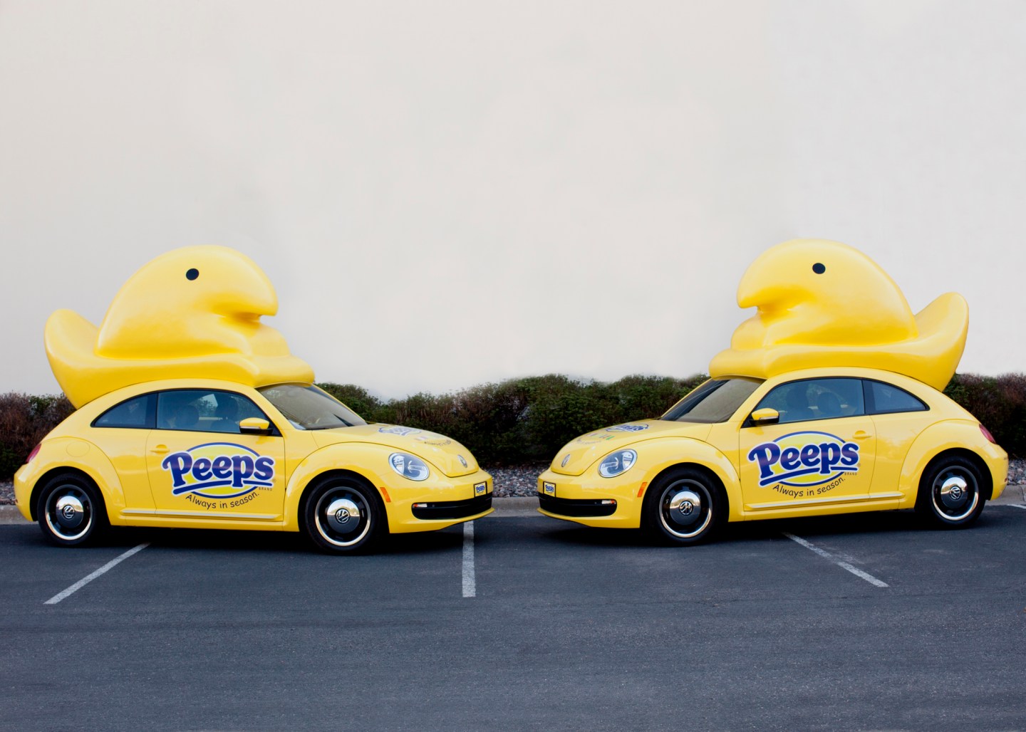 Before making the sugary chicks and other holiday confections fit for any occasion, Just Born hit the road with the Peepsmobile for the brand's 50th anniversary in 2003. There are now three cars total, two of which were manufactured a decade later. Each gigantic yellow peep sits atop a yellow Volkswagen Beetle.
