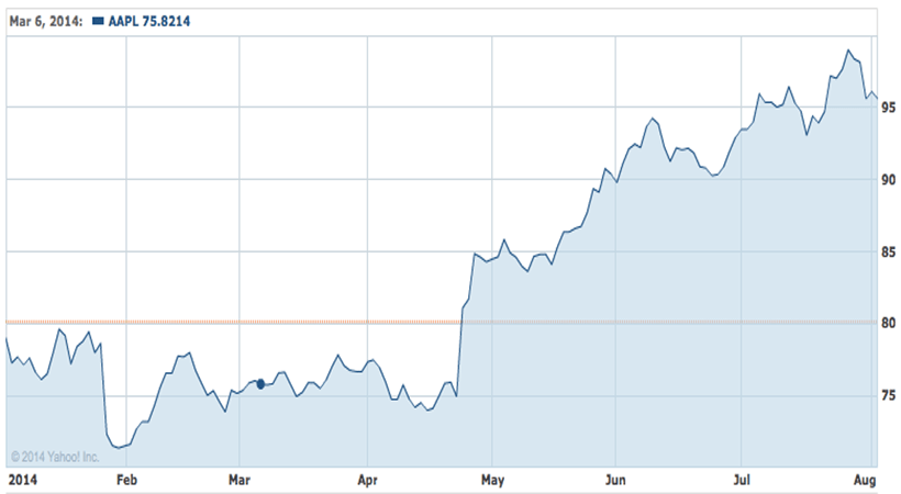 “[Apple] is up 25% since it spent $18 billion on its own shares between January and March and rallied 32% after a $16 billion buyback in 2013. Those are the highest four-month returns among the 20 biggest quarterly repurchases by any company since 1998, according to data compiled by Bloomberg and Standard & Poor’s.”