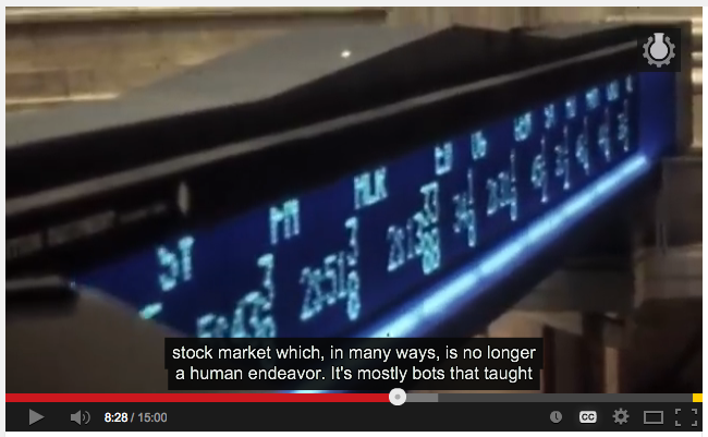 “In many ways,” the speaker continues, the market “is no longer a human endeavor. It’s mostly bots that taught themselves to trade stocks, trading stocks with other bots that taught themselves.