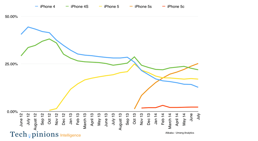The blue (iPhone 4) and green (iPhone 4S) lines represent devices that were likely purchased secondhand or through China’s powerful grey market.