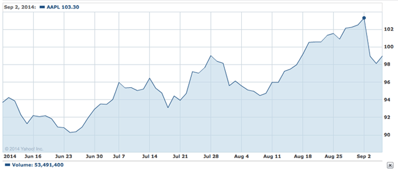 Gene Munster, Piper Jaffray: How AAPL Trades Into iPhone Events/Launches. “Based on historical trading patterns for AAPL shares into iPhone events and product launches, it appears that shares of AAPL could see some slight headwinds on both the day of the event and the day of the launch. Typical trading data suggests that shares of AAPL typically trade down slightly on iPhone event and launch days (note: historical performance does not guarantee future performance). We continue to believe that the iPhone 6 should be able to meet or exceed investor expectations and also note that the potential of an iWatch announcement on Tuesday could work as an additional positive catalyst. We continue to believe that those trying to play AAPL for iPhone 6 should own shares now until the launch and avoid the opening weekend numbers given difficult comps from the iPhone 5C channel fill. Overweight. $120.