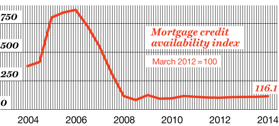 To be sure, stringent loan requirements are not the only impediment to a housing rebound. Numerous studies show that millennials are much more inclined to delay home purchases than earlier generations. Gen Yers may prefer the greater mobility of renting (or living free for a while with Mom and Dad). Many also suffer from high student-debt loads, weak credit histories, a tough job market, and moribund wage growth.