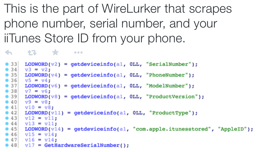 “WireLurker is capable of stealing a variety of information from the mobile devices it infects and regularly requests updates from the attackers command and control server. This malware is under active development and its creator’s ultimate goal is not yet clear.”