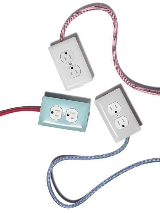 Why should extension cords be ugly? With gorgeous cloth-wrapped cords and bright powder-coated aluminum housing, all made in the U.S., the Extō can hang on a wall or just make a desk a happier place.