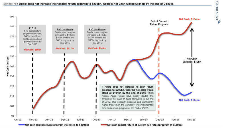 When it was announced three years ago, the plan was to return $45 billion to shareholders by the end of 2015. As the cash kept pouring in, however, Apple increased its target in each subsequent year — first to $100 billion, then to $130 billion. If Apple doesn’t increase its cash return program to $200 billion, says Garcha, net cash by the end of 2016 will stand at $184 billion — nearly double the hoard Apple had on hand three years ago when the program began.
