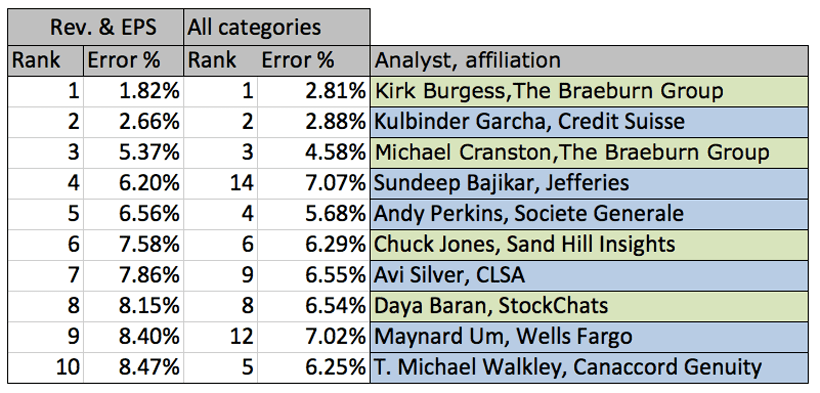 - For the second quarter in a row, Kirk Burgess of the amateur Braeburn Group has come out on top, this time both for overall accuracy and for the top and bottom lines. Someone should hire that guy — if they haven’t already.