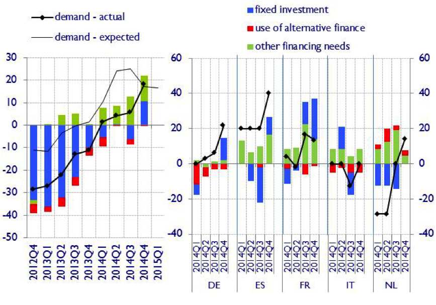 But the broader data from the ECB’s report also suggest that things have turned. Both broad and narrow measures of the money supply have turned up, and the ECB’s Bank Lending Survey released last week showed that not only are banks more willing to lend–businesses are starting to look a lot more willing to invest.