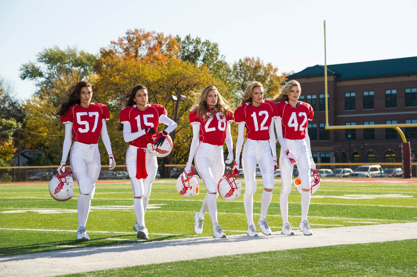 Even Victoria’s Secret is toning its ad down this year by featuring their models fully clothed in football gear.