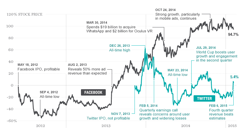 Twitter’s IPO may have gone smoothly, but problems began to pile up soon afterward. Despite rapidly accelerating revenue, the rate that Twitter added monthly active users slowed—less than 4%, to 241 million, in its first quarter as a public company, and as low as 1.4% in a recent quarter—worrying investors that Twitter might not be the mainstream product that its soaring valuation promised. (Just 36% of Twitter users access it daily, according to Pew, well below the 70% for Facebook.) The departure of top executives in 2014—COO Ali Rowghani, CFO Mike Gupta, and several vice presidents—further spooked investors.