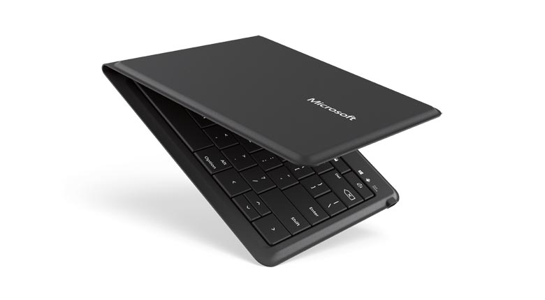 Microsoft unveiled the Universal Foldable Keyboard on Monday, a thin, lightweight keypad that folds down the middle. Unfold the keyboard and it automatically powers on and connects wirelessly to Bluetooth-enabled phones or tablets. The battery lasts upwards of three months on a single charge, according to Microsoft.
