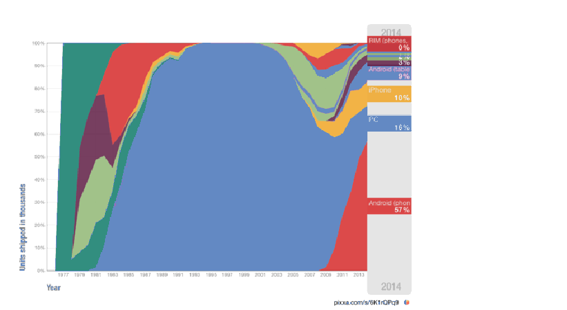 It’s a picture of the modern computing era drawn using an app called Perspective that allows raw data to be revealed one frame at a time, like a motion picture. The data in this case are market shares of computing platforms shipped each year from 1977 to 2014.