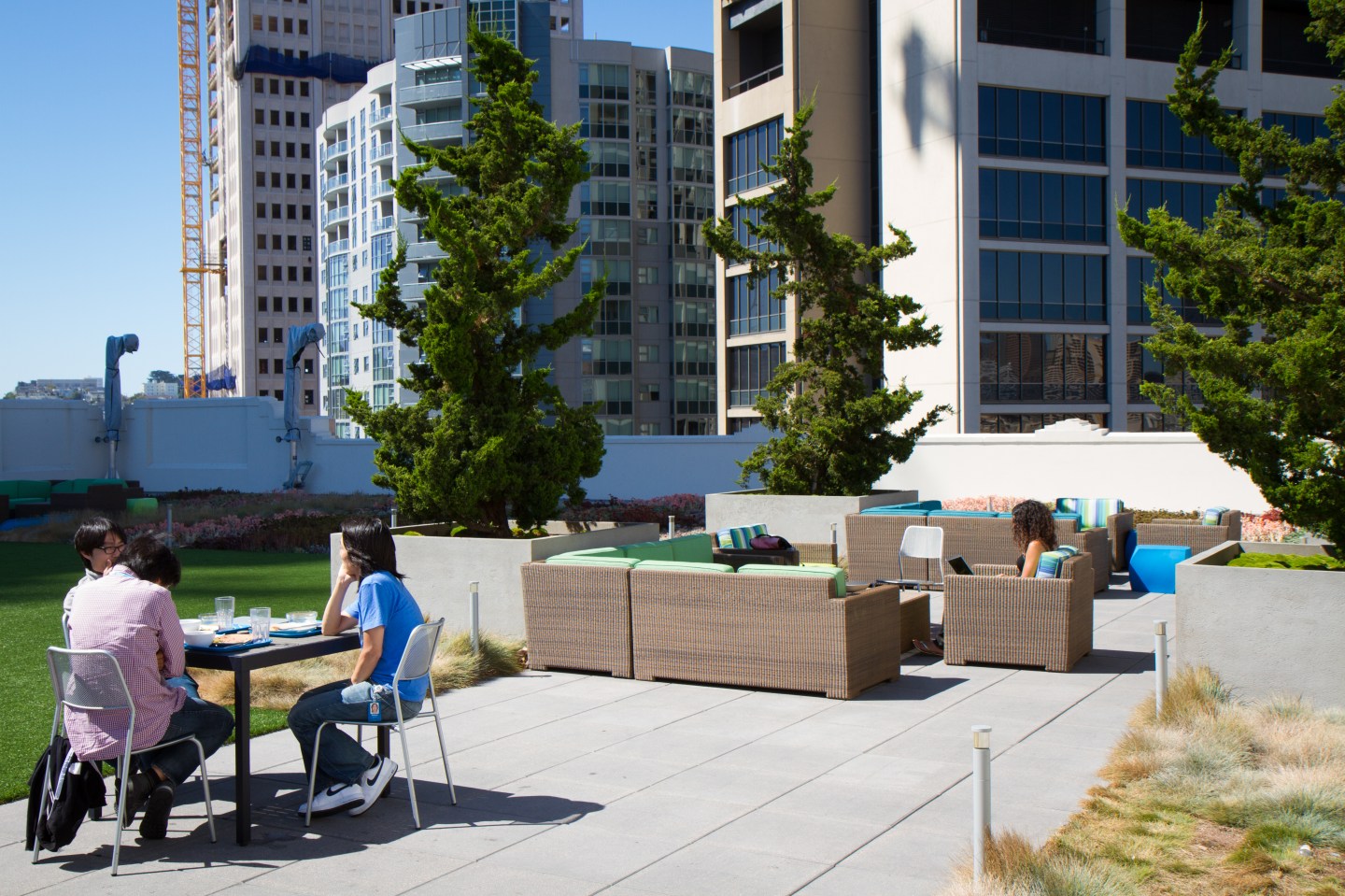 The crown jewel of Twitter's San Francisco headquarters is a 16,500 rooftop deck with expansive views of the city. Employees use the space to socialize, relax and (sometimes) work.