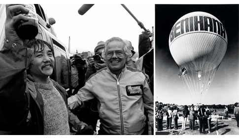 In November, 1981, Aoki and three other men made a harrowing and record-breaking 5,208 mile balloon ride across the Pacific. The Double Eagle V balloon set sail from Nagashima, Japan; the balloon picked up ice and floated at low altitudes across the ocean. It crash-landed 84.5 hours later in the mountains of Northern California during a driving rainstorm. In an effort to slow the balloon’s descent, the crew had thrown equipment overboard; Aoki was knocked unconscious in the landing. The whole crew was fished out the tree the following day and received by well-wishers and a mariachi band in Albuquerque. "If you are afraid to die, you are probably afraid to live," Aoki said at the time.
