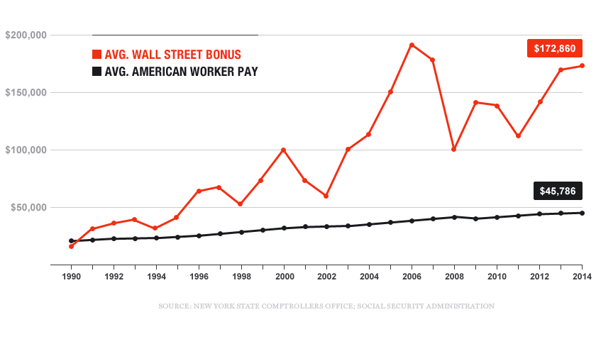 Take a look at Wall Street pay over time versus the average worker. The average Wall Street bonus last year was nearly four times as large as the total pay of the average American worker. And this is just the bonus. Wall Streeters also receive base salaries, which have been growing over the years, and stocks options and other forms of deferred compensation that are not in the Comptroller’s numbers.