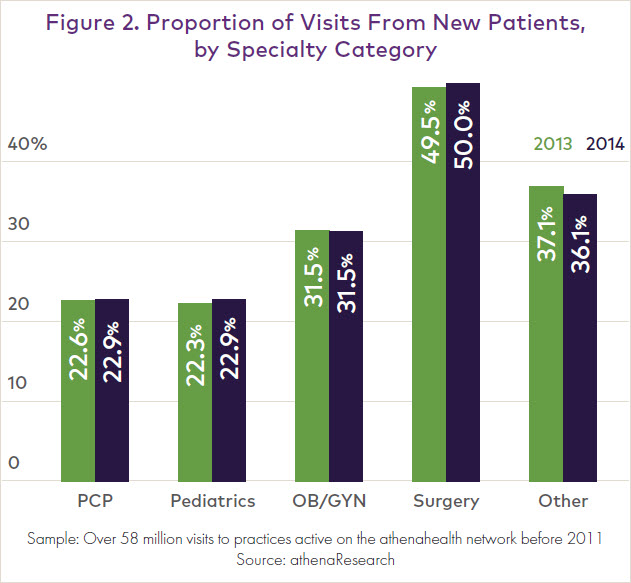 For instance, primary care practitioners had 22.9% of their visits from new patients last year, up from 22.6% in 2013. That is only a 1.3% increase year-over-year, and the new patient influx has been less pronounced for obstetricians/gynecologists and other specialty practitioners.