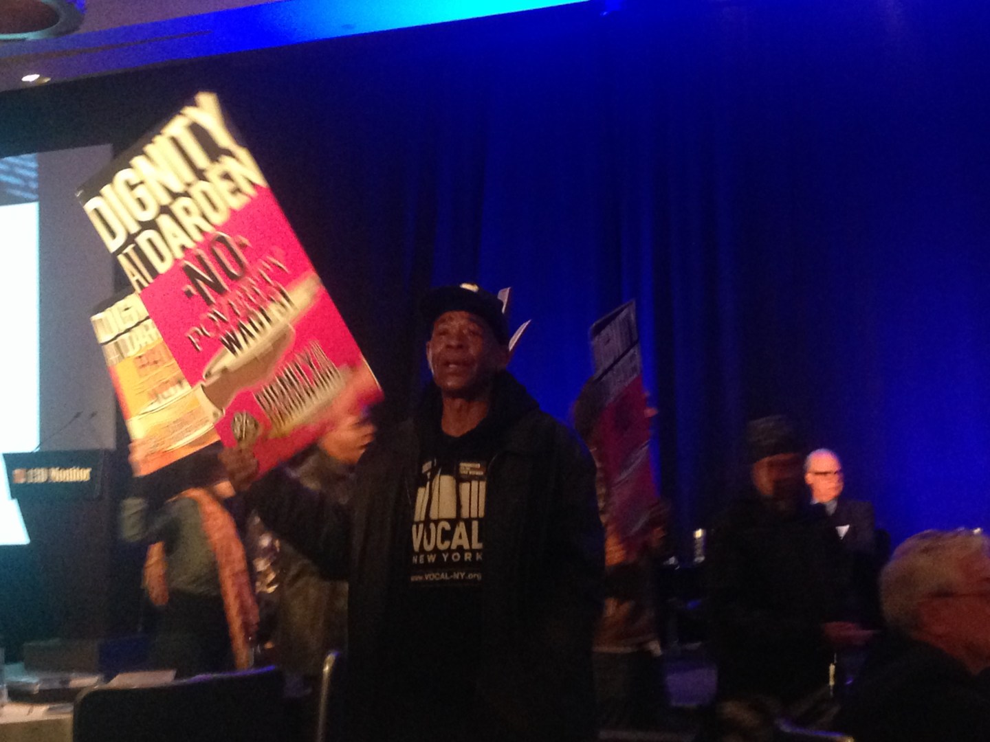 On Monday, a gathering of hedge fund investors, who push for changes at companies, was temporarily shut down by activists of the more traditional variety. Some 20 protesters entered the main room of the Active-Passive Investor Summit, which was being held at the Crowne Plaza in midtown Manhattan, around mid-day and began chanting and marching back and forth in front of the stage. The conference organizers seemed unprepared for the protest, which lasted for about 20 minutes.