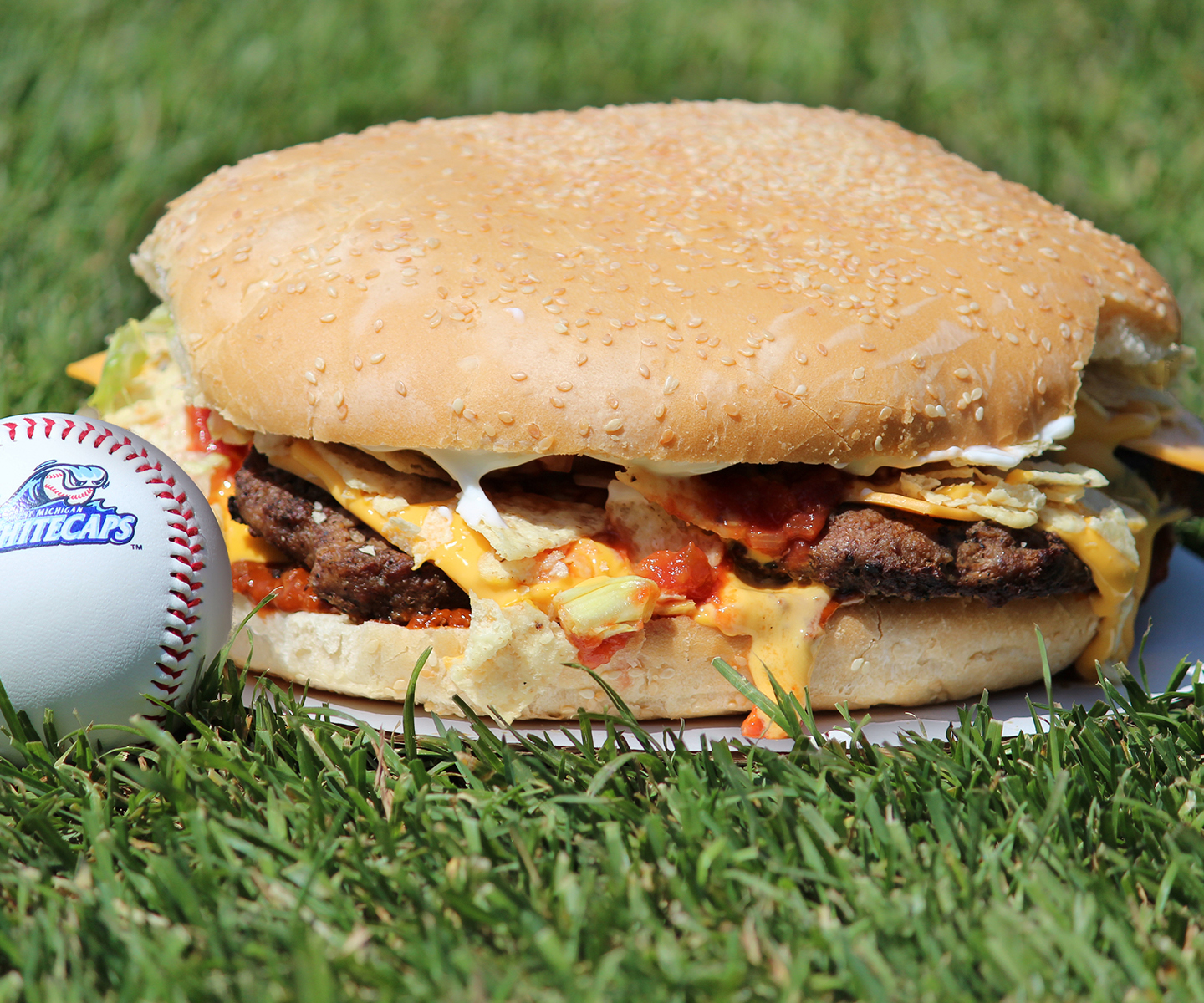 The minor league West Michigan Whitecaps’ Fifth Third Ballpark offers this pile of food, weighing in at more than four pounds. The $20 Fifth Third Burger has five one-third-pound burgers (making five thirds of a pound), a cup of chili, five slices of American cheese, salsa, nacho cheese, Fritos, lettuce, tomato, sour cream and jalapenos. Anyone who can consume this bomb of 4,800-plus calories and nearly 300 grams of fat in one shot wins a T-shirt. The ballpark also sells the Baco, a bacon-encased taco.